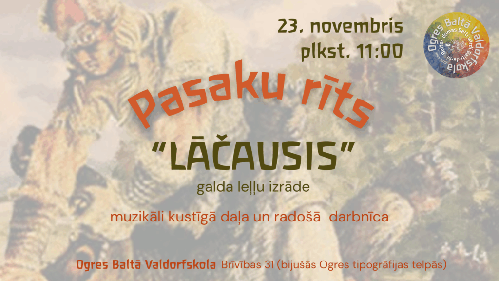 Jaunumi Pasaku rīts 23. novembrī “LĀČAUSIS” 19. novembris, 2025. Bērni, viņu vecāki un visi, kam mīļa pasaka, laipni aicināti piedzīvot galda leļļu izrādi “Lāčausis”. Pasakas bērnam ir kaut kas ļoti īpašs. Klausoties stāstā, kas izteikts ar mīlestību, bērns ieiet tēlainā pasaulē, kurā viss ir dzīvs un kustīgs, gluži kā rotaļā. Pasaka palīdz piedzīvot jūtas, kas […]