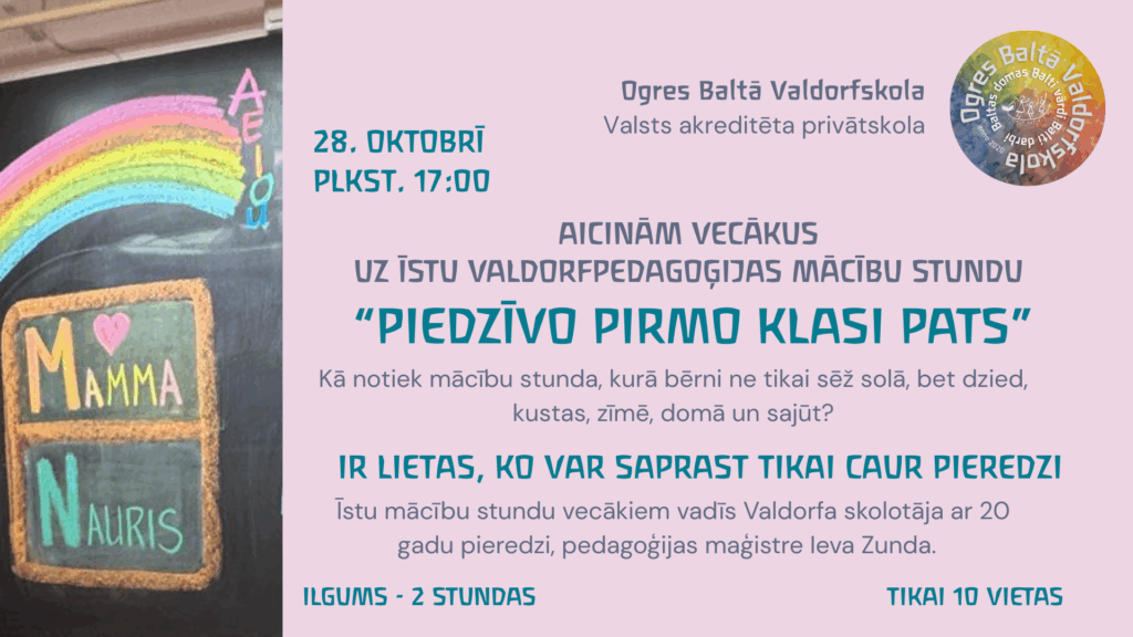 Jaunumi Valdorfpedagoģijas mācību stunda “Piedzīvo pirmo klasi pats!” 9. oktobris, 2025. Vai gribi uzzināt, kā mācās Valdorfa skolas bērni? Nāc un piedzīvo to pats – ieņem vietu skolas solā un saproti, kāpēc šī metode iedvesmo bērnus mācīties ar prieku.Aicinām pirmklasnieku un topošo pirmklasnieku vecākus uz mācību stundu, kurā vecāki paši varēs izjust pārsteigumus un atklājumus — tieši tā, kā to piedzīvo ikviens Valdorfskolas bērns.Divu stundu laikā kopā ar Valdorfa skolotāju un pedagoģijas maģistri Ievu Zundu, kura Valdorfpedagoģijā darbojas jau vairāk kā 20 gadus, piedzīvosiet kā notiek mācīšanās:• Iepazīsiet metodes, kas attīsta radošumu, domāšanu un iekšējo motivāciju• Sajutīsiet, kā mācības var kļūt par dzīvu un priecīgu pieredzi• Uzzināsiet, kā Valdorfa pedagoģijā tiek apvienots intelekts, emocijas un kustībaPēc mācību stundas būs iespēja tikties ar Ogres Baltās Valdorfskolas pārstāvjiem, ja būs radusies interese – pastāstīsim vairāk.Mācību stunda vecākiem notiek 28. oktobrī plkst. 17:00Ogres Baltā Valdorfskola telpās, Brīvības ielā 31, 1.klases telpāMācību stundas ilgums – 2 stundas.Vietu skaits ierobežots — tikai 10 vecākiReģistrējies, lai rezervētu vietu – https://ej.uz/z24q, ja ir jautājumi, sazinies ar Līgu – 25467729.